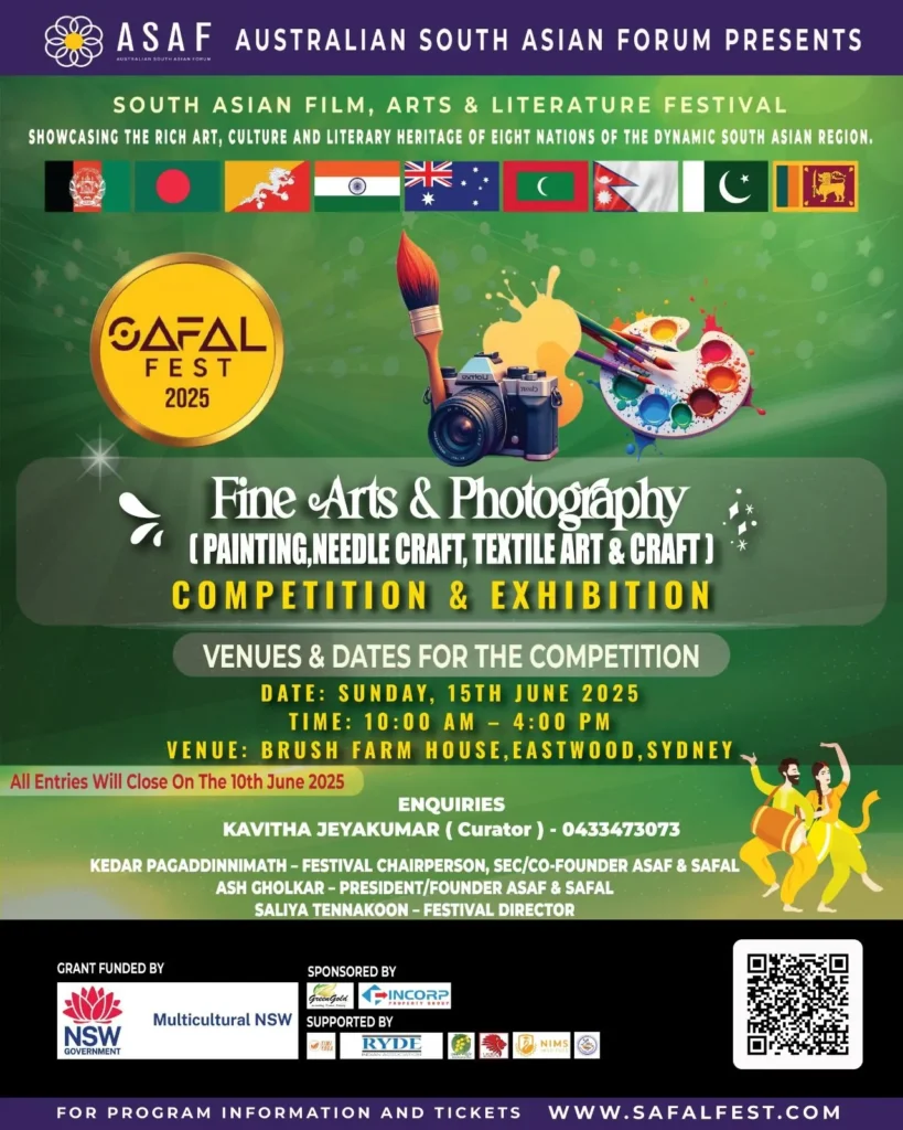 Dive into the vibrant world of visual arts and craftsmanship at the SAFAL Fest 2025, proudly hosted by the Australian South Asian Forum (ASAF). This Fine Arts & Photography Competition & Exhibition celebrates the creative excellence of South Asia through painting, needle craft, textile art, and crafts.