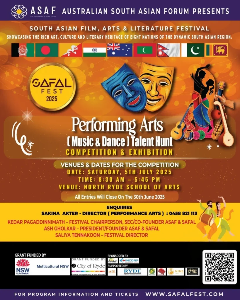 The Australian South Asian Forum (ASAF) proudly presents the Performing Arts Talent Hunt as part of the SAFAL Fest 2025 β a celebration of South Asian Film, Arts & Literature. This exciting event showcases the music and dance traditions of eight vibrant South Asian nations, reflecting the regionβs rich cultural and artistic heritage.